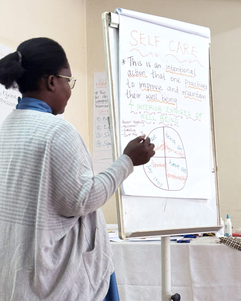 The program provided an intensive exploration into the synergy between mental health and the arts. The first day had a slow start due to the rain and notorious traffic in Kampala, with many participants travelling for hours to attend the workshop. The morning sessions established a foundation in basic counselling concepts and skills, with a specific focus on applying these concepts with creative frameworks. Therapeutic dance and movement practices were explored through the Laban movement analysis framework to understand the physical dimensions of communication and how workers can practice noticing the people they work with in creative ways.